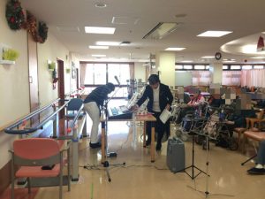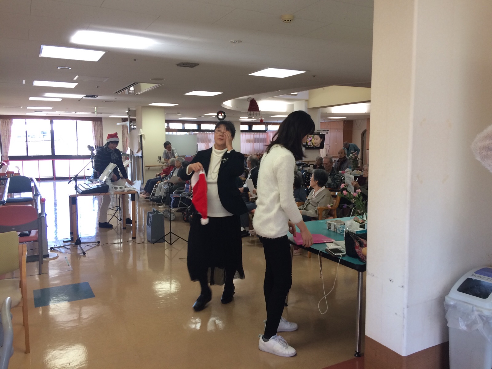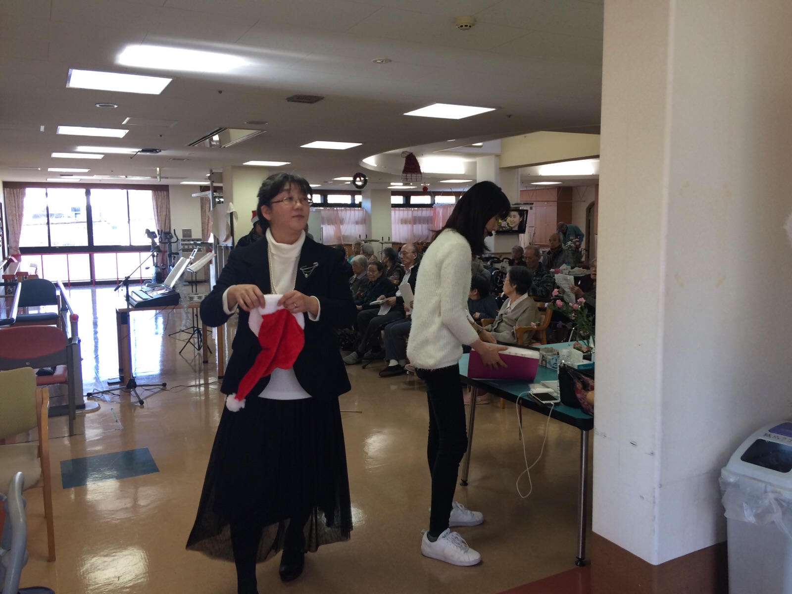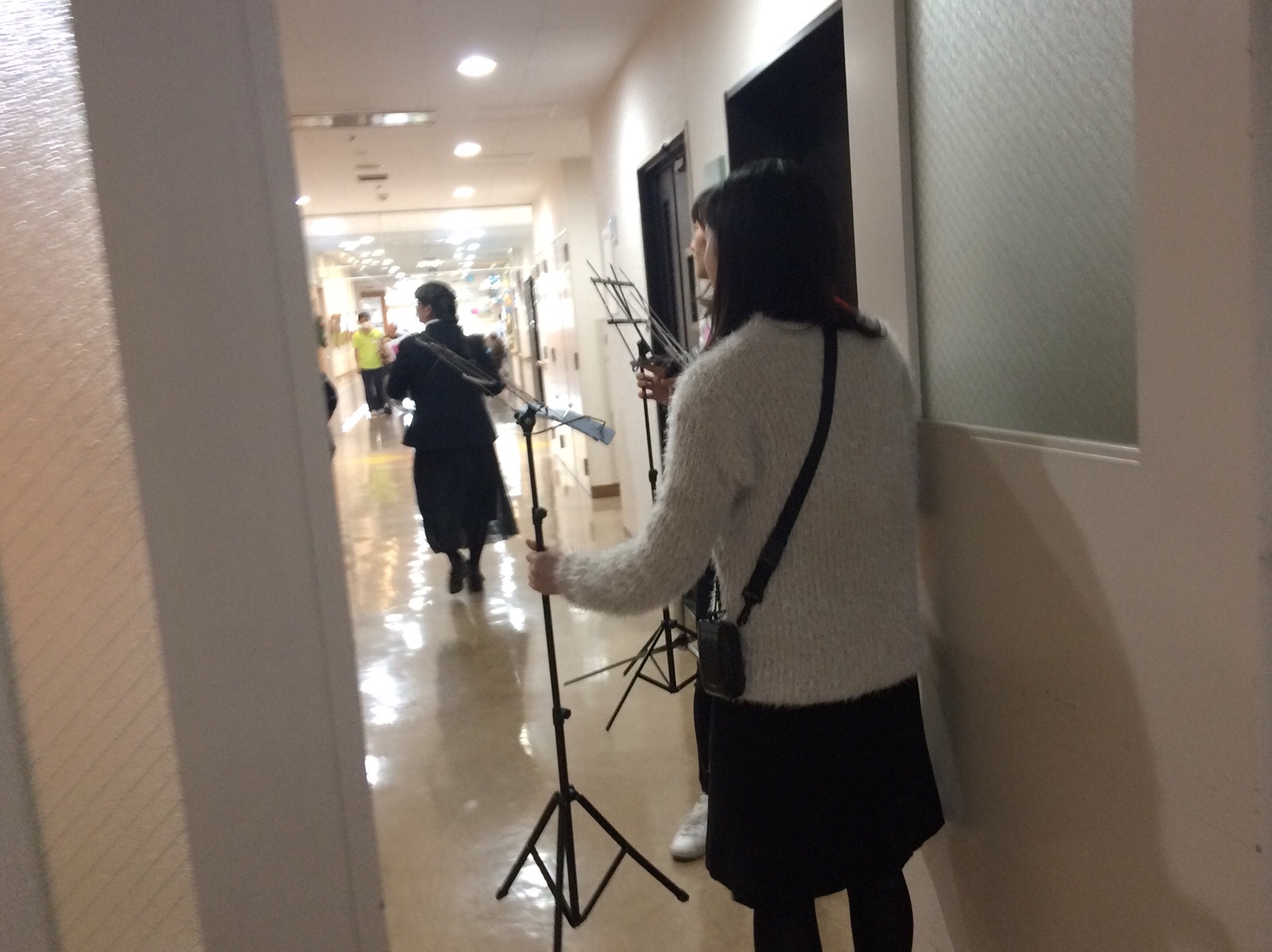 クリスマスの飾りつけが華やかな会場の奥でコンサートです。