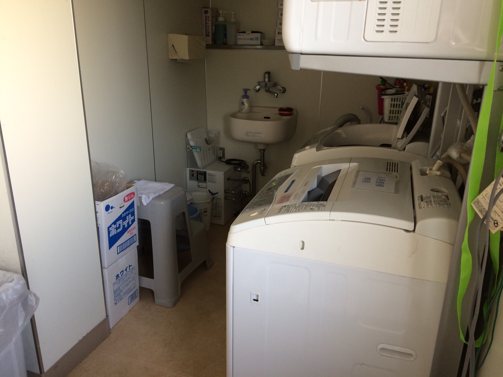 ここは、洗濯室です。お部屋に洗濯機がある方と、ここで洗濯する方がいらっしゃいます。 ミカエル