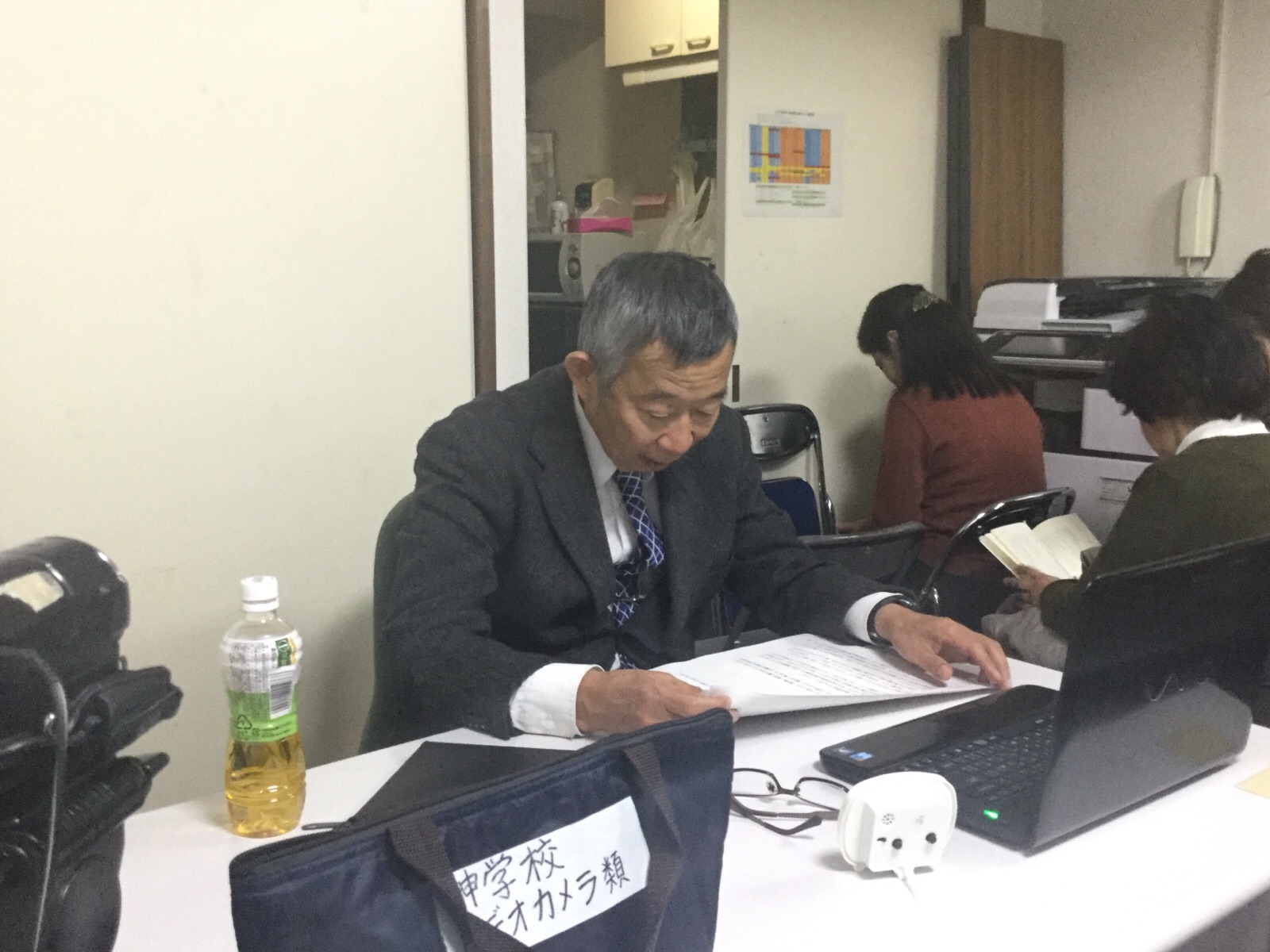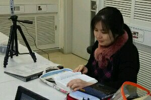 インターナショナル礼拝に備えて同時通訳準備中のYさんです。おっ!英語の聖書読んでます。当たり前か?!