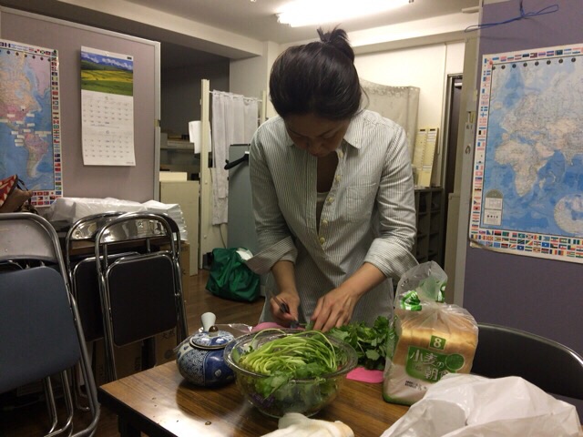 小代さん、三つ葉を黙々と切っています。Noe