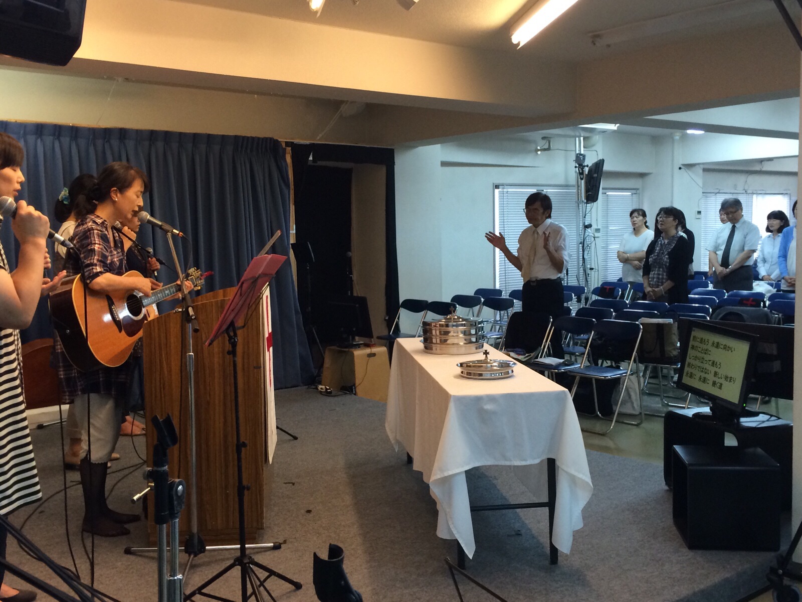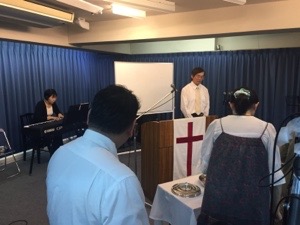 聖餐式の時。 第二礼拝のメッセンジャーの窪田さんが導きます。