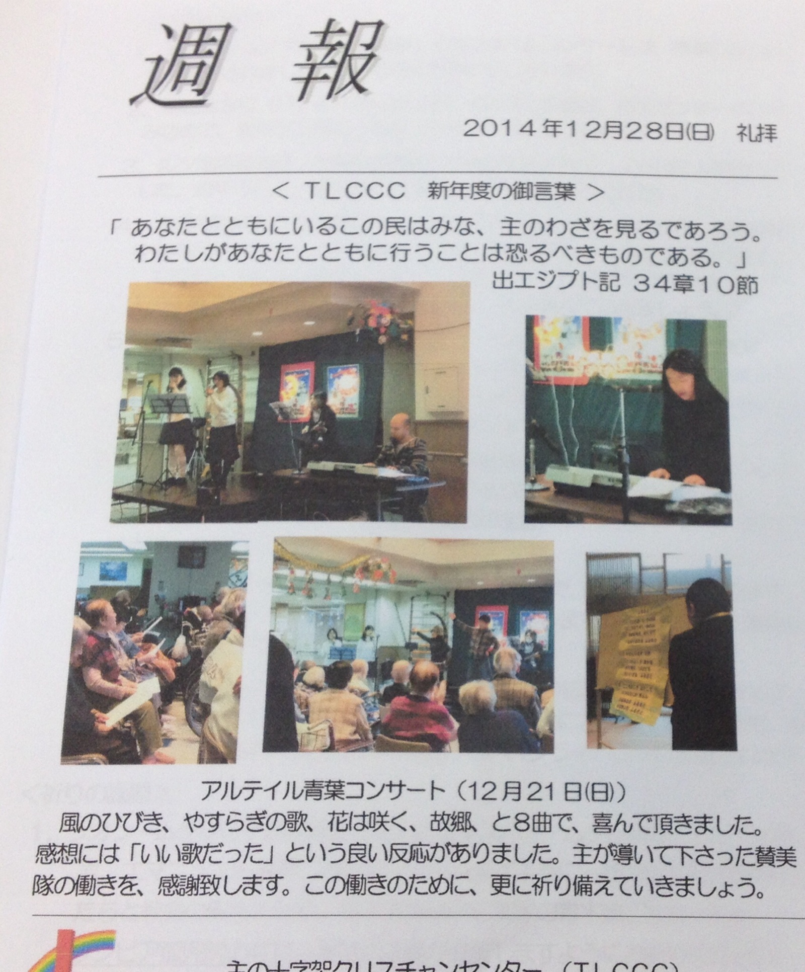 週報は、先週行われた老人ホームでのゴスペルコンサートの写真です。仙台 東フィラデルフィヤ教会