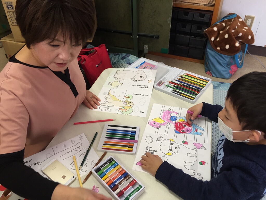お祈りの後はぬり絵! 好きな色はピンクなんだって^ – ^ 四日市シオン教会