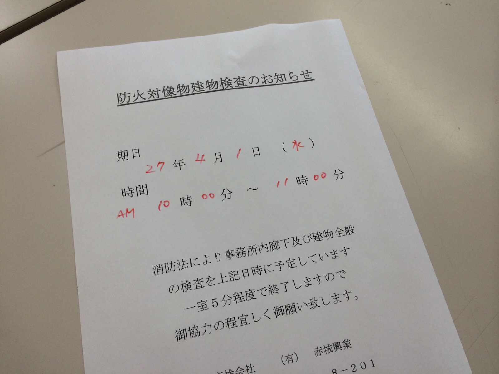 郵便受けに、こんなの入ってました。多分、天井にある火災報知器を検査するだけです。