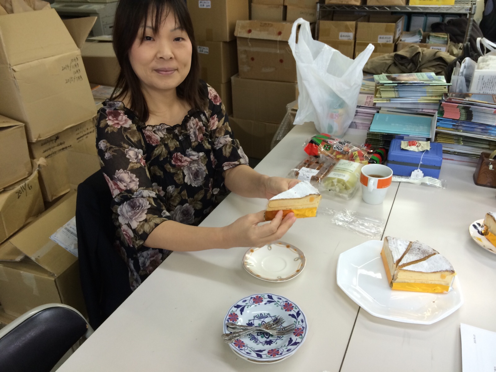 チーズケーキにした理由は、男性が二人いるからだそうです。 女性も好きですよね〜チーズケーキ。 (日本教会史担当 横尾)