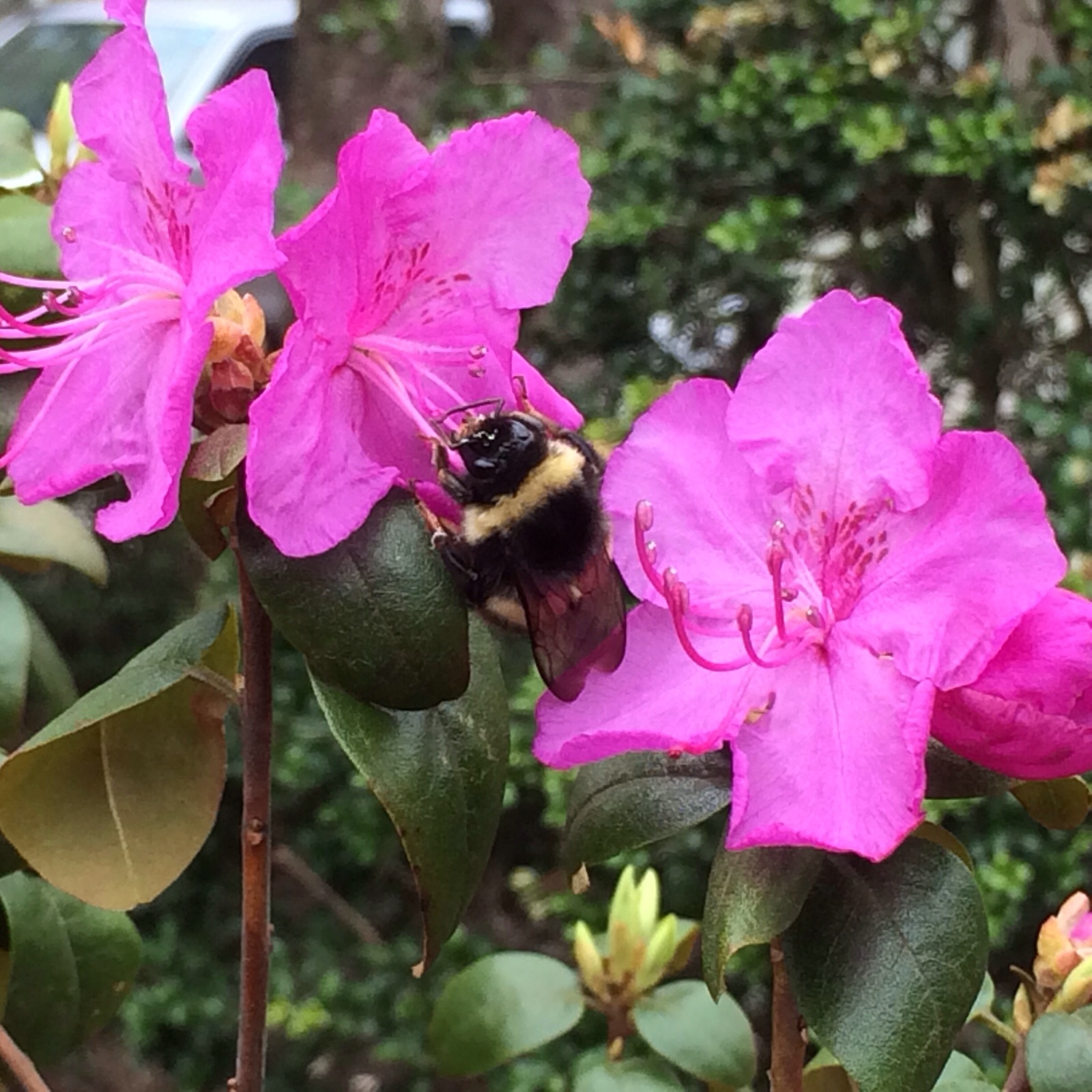 ムラサキツツジ ブーン っと、すごい音をたてて 西洋丸花蜂が飛んで来ました。花の蜜を吸ってます。 北アンテオケ教会