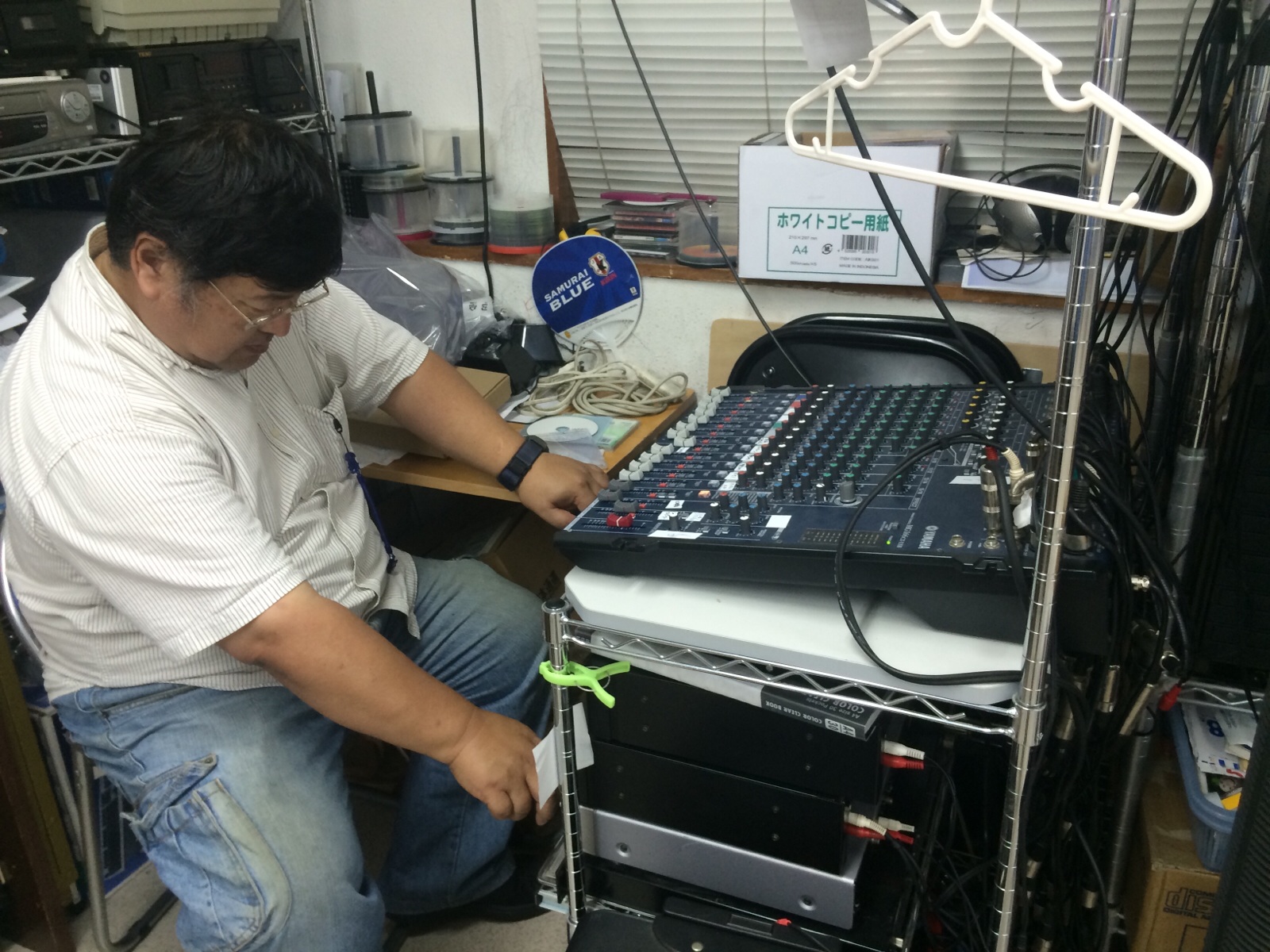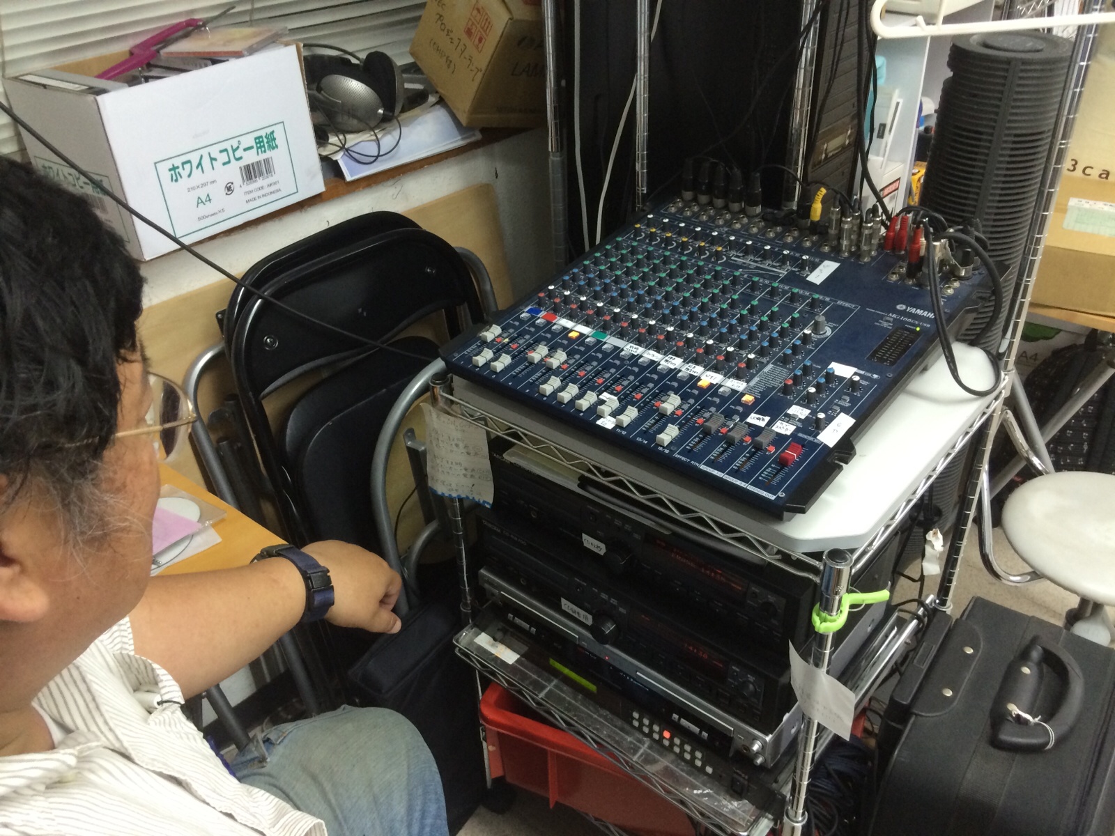 永藤さんが機材の確認をしています。普段はあまり使っていない機材も起動させます。 さとP