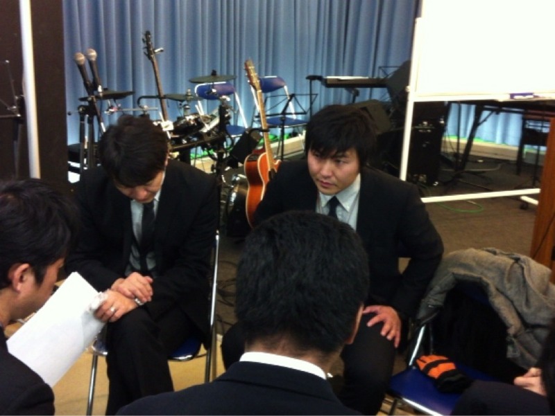 お休みに出かけた場所のお土産が配られています。設営部隊は、体力勝負ですから甘いものは貴重です。全員揃ってからお祈りが始まりました。今日も礼拝、聖会ともよろしくお願いします!
