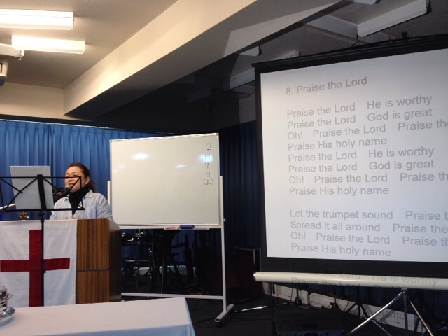 土曜礼拝です。まりこさん、早速英語の歌で賛美しています!