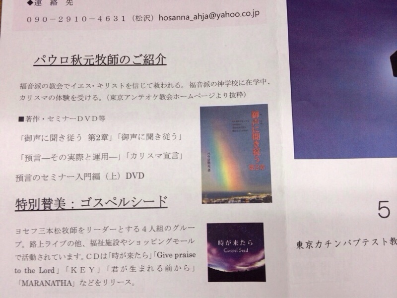 プログラムの裏面で秋元牧師の紹介や、〝御声に聞き従う2章〟などの書籍やDVD、GospelSeedのCDなどを紹介してくださっています!