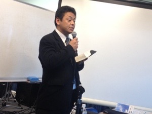 集会担当の益川さん、木曜まで行っていたハワイチームの証しをしています。