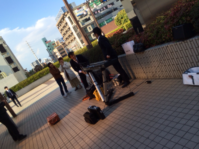 ギフツが賛美している所は、船橋のバスターミナルの2階部分にあたるデッキです。背景の塔は「アンデルセンの塔」という、アンデルセンの故郷、デンマーク王国オーデンセ市と姉妹都市であることから建てられました。1時間ごとに、鐘の音と共に童話の王子とお姫様が登場します。その時はギフツは少しの休憩となります。