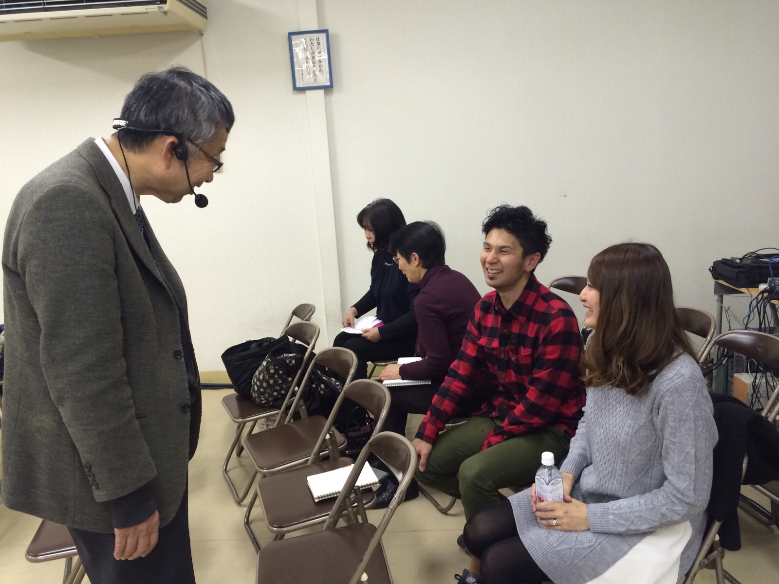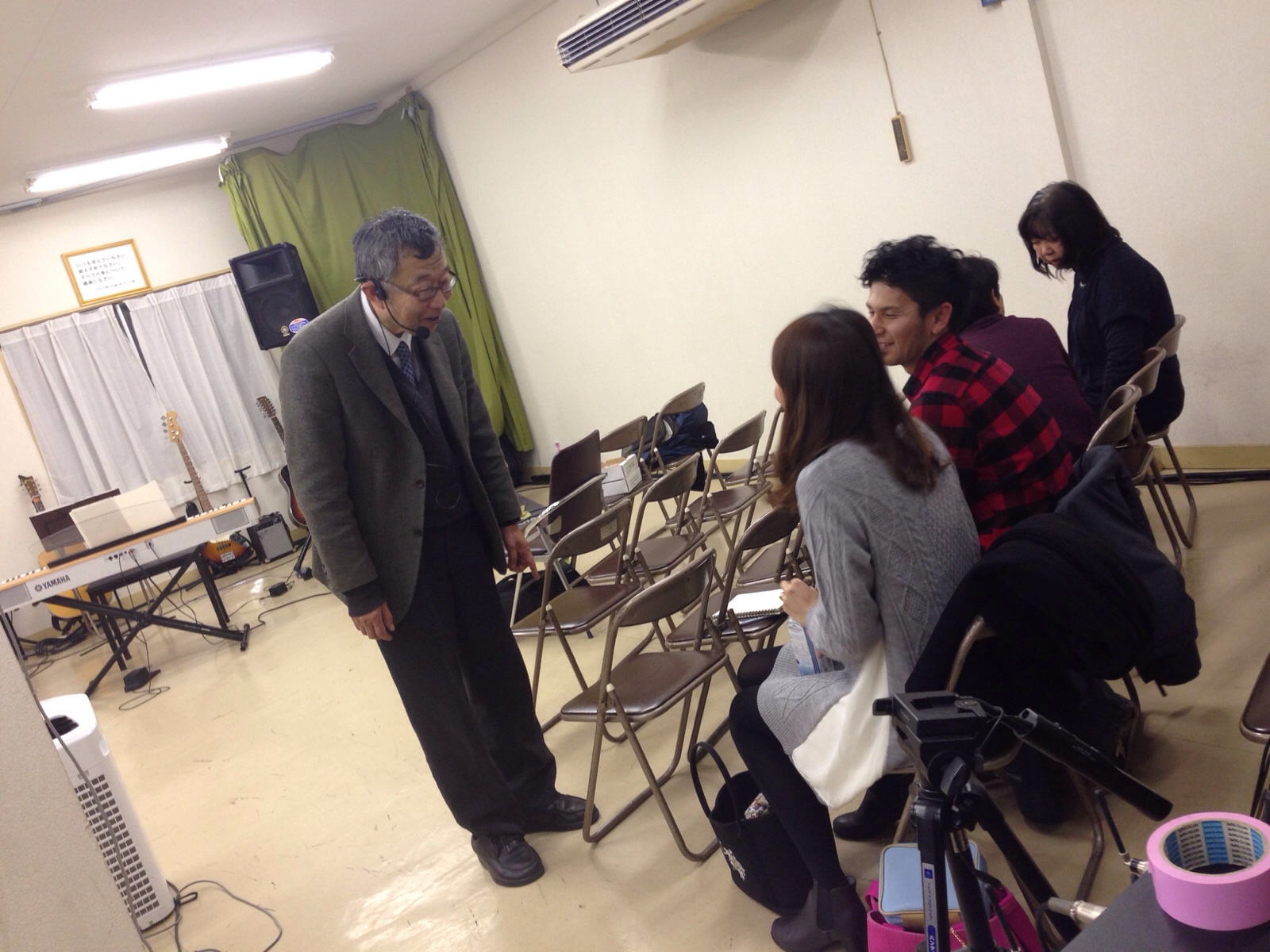 休憩時間に寺田さん夫婦とお話ししておられます。 四日市シオン教会
