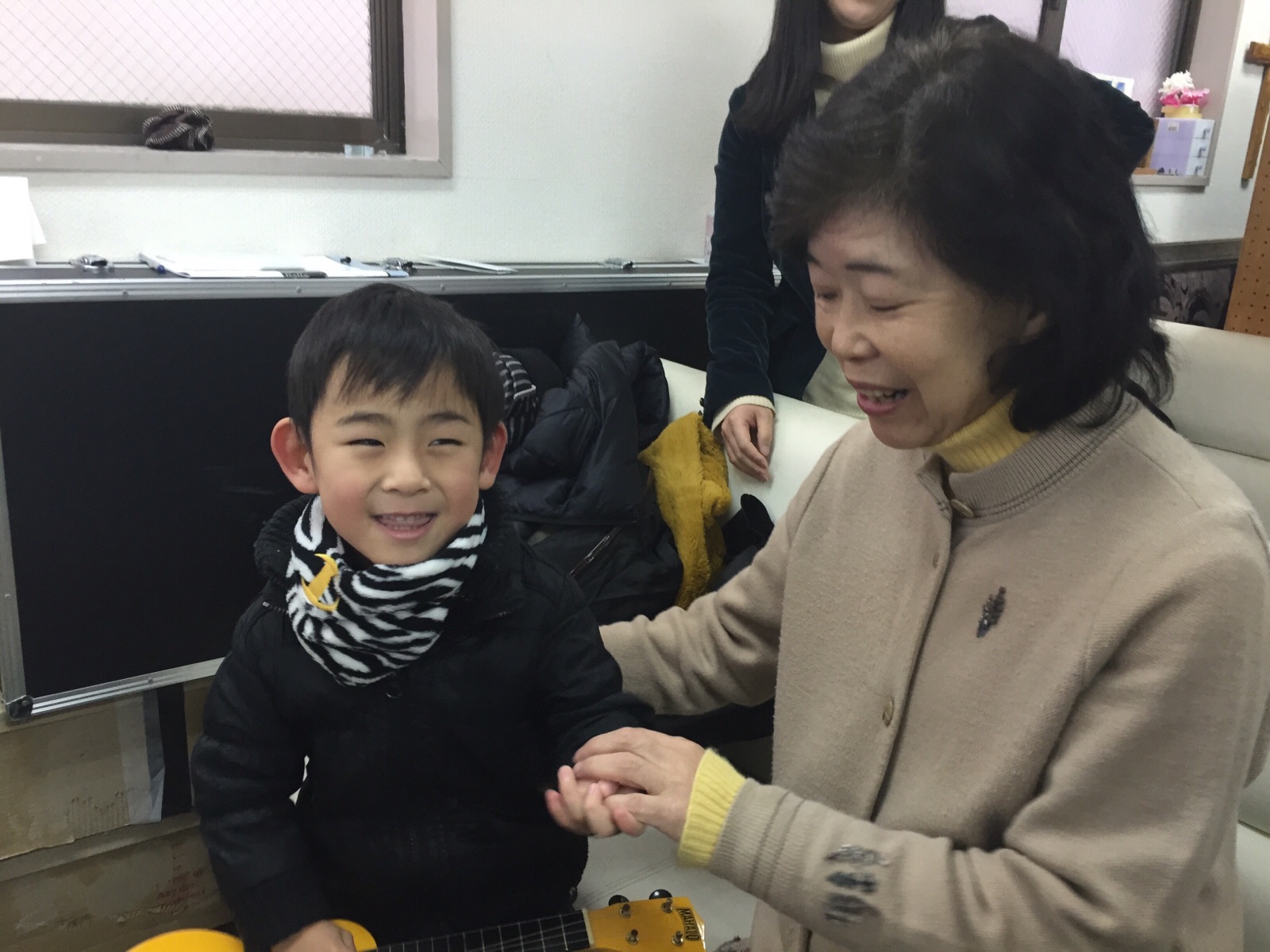 ヨシュアくん、ウクレレもって第二礼拝に参加。