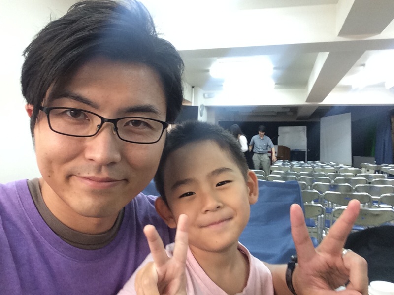 これから音響の仕込みです! Gospel seedのヨセフ三本松さんのご長男 ヨシュアくんと記念撮影です! ひかる
