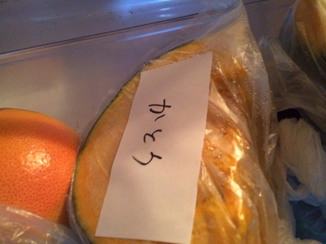冷蔵庫に昨日もらったカボチャを入れていて、開けて、どっち? と思ったら…ちゃ〜んと名前が書いてあった! Gifts Kayano