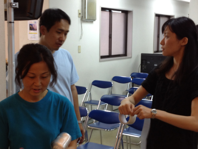 藤井君、益川さんがうやうやしく持ち上げてセッティング。 気をつけて、と気遣う輝美ちゃん。