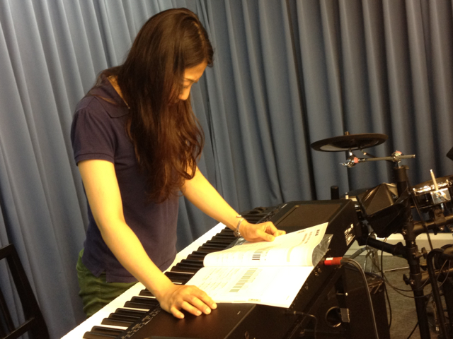 輝美ちゃん、新しいキーボードの操作を確認中。真剣な眼差し。