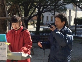 「冬に土方ジャンバーを着てチャリティーライブで歌っている時のです。面白い写真がなくてすみません。隣りは妻です。」