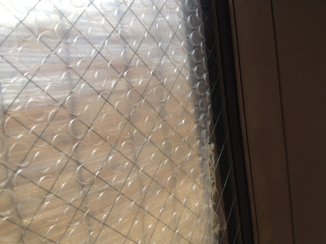 教会事務所の窓に貼ったプチプチ。これは冬の防寒対策です。同じ意味で暑さ対策にもなるかなと、貼りっぱなしです。