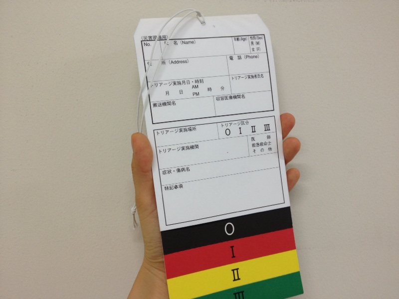こちらが、トリアージタッグです。災害時、傷病者の重症度分類に使います。 Imai