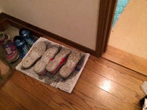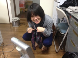 雨で靴下が濡れてしまって乾かし中の、愛ちゃん! 「明日は晴れるかな〜?」と言っています。