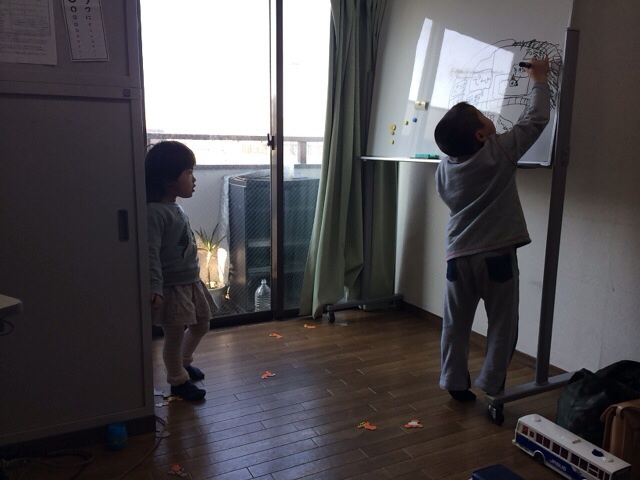 今日は、お友達が来てくれてます〜☆ ルンちゃん、何を描いているか見ています(^ー゜)