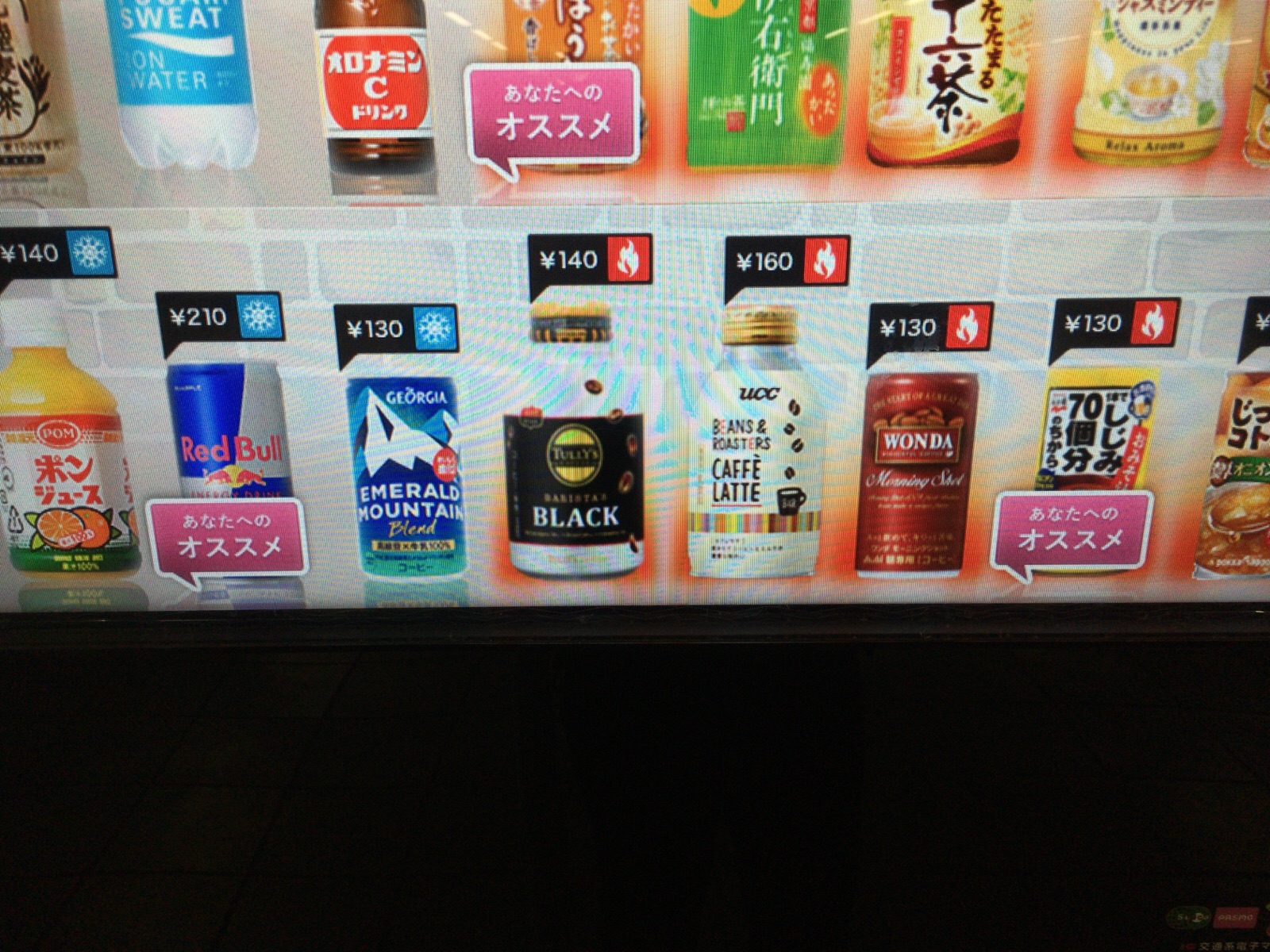 駅にある自動販売機の前に立ってみると、、、あなたにオススメと。 軽い人工知能を、使ったものですが栄養ドリンクとしじみとは。 疲れていると認識されたのか笑 Samuel