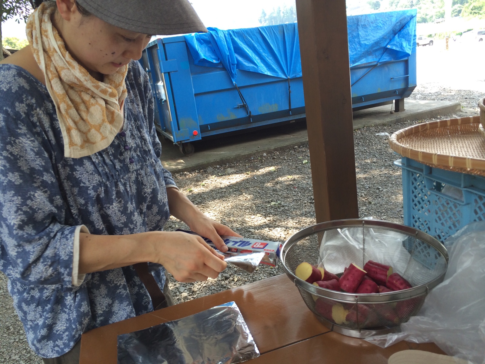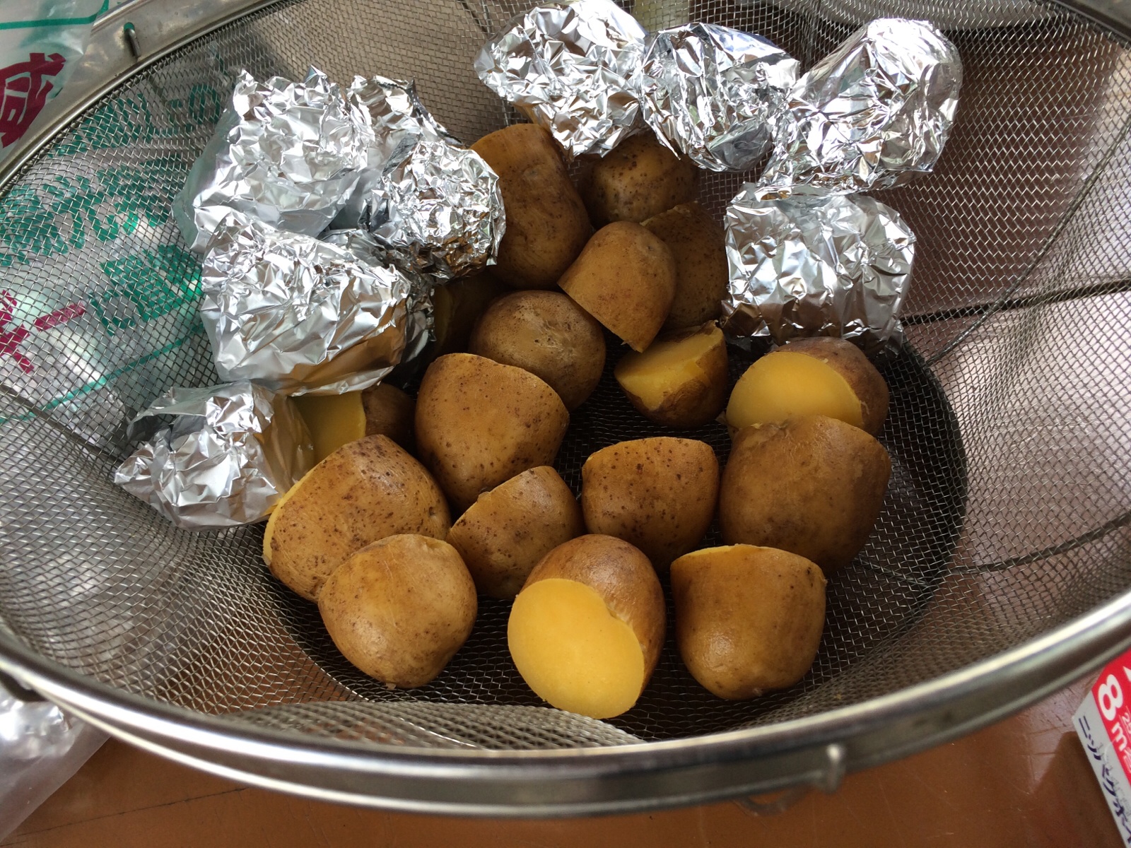 アルミホイルで包んでます。 ジャガイモの色が黄色だ〜。