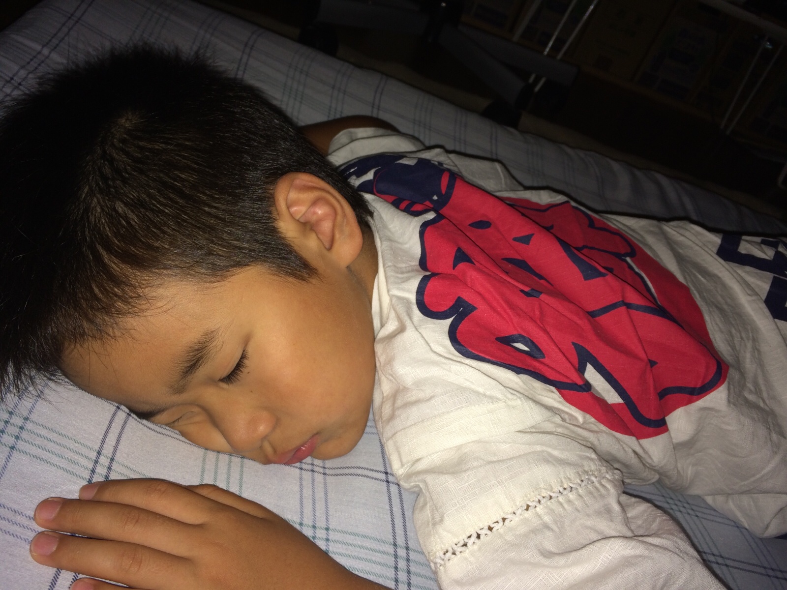 いとこのやまとくんからゆずり受けたジンベイ。明日のデイキャンプの前にお祭り気分で寝ちゃいました♪ 大和教会 na