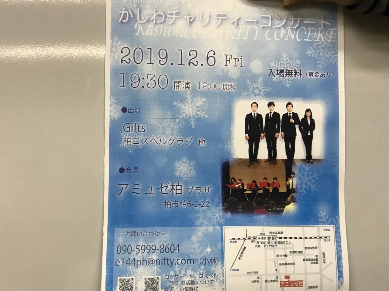 今日のコンサートはアミュゼ柏 プラザ開場19」00 開演19:30