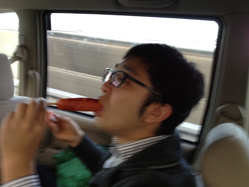 焼肉串と五平餅、揚げたこ焼きを買いました。 お店のおじさんに話を聞くと、どうやら道が混んでるようです。