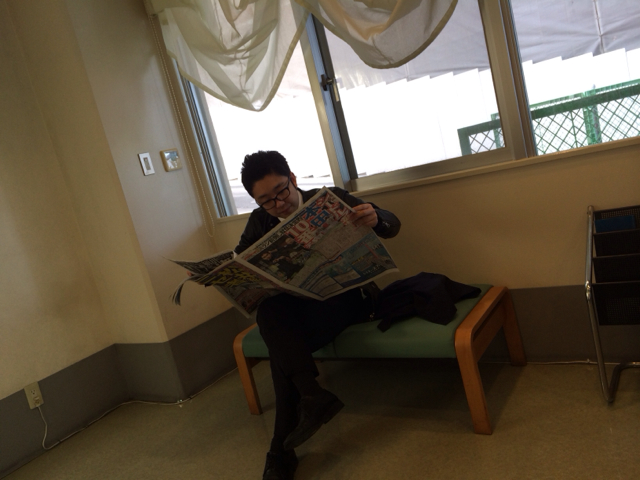 ヨハネ君は新聞を見てます。