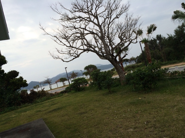 会館の庭に出てみたら、綺麗! 向こうは沖縄の海でした!