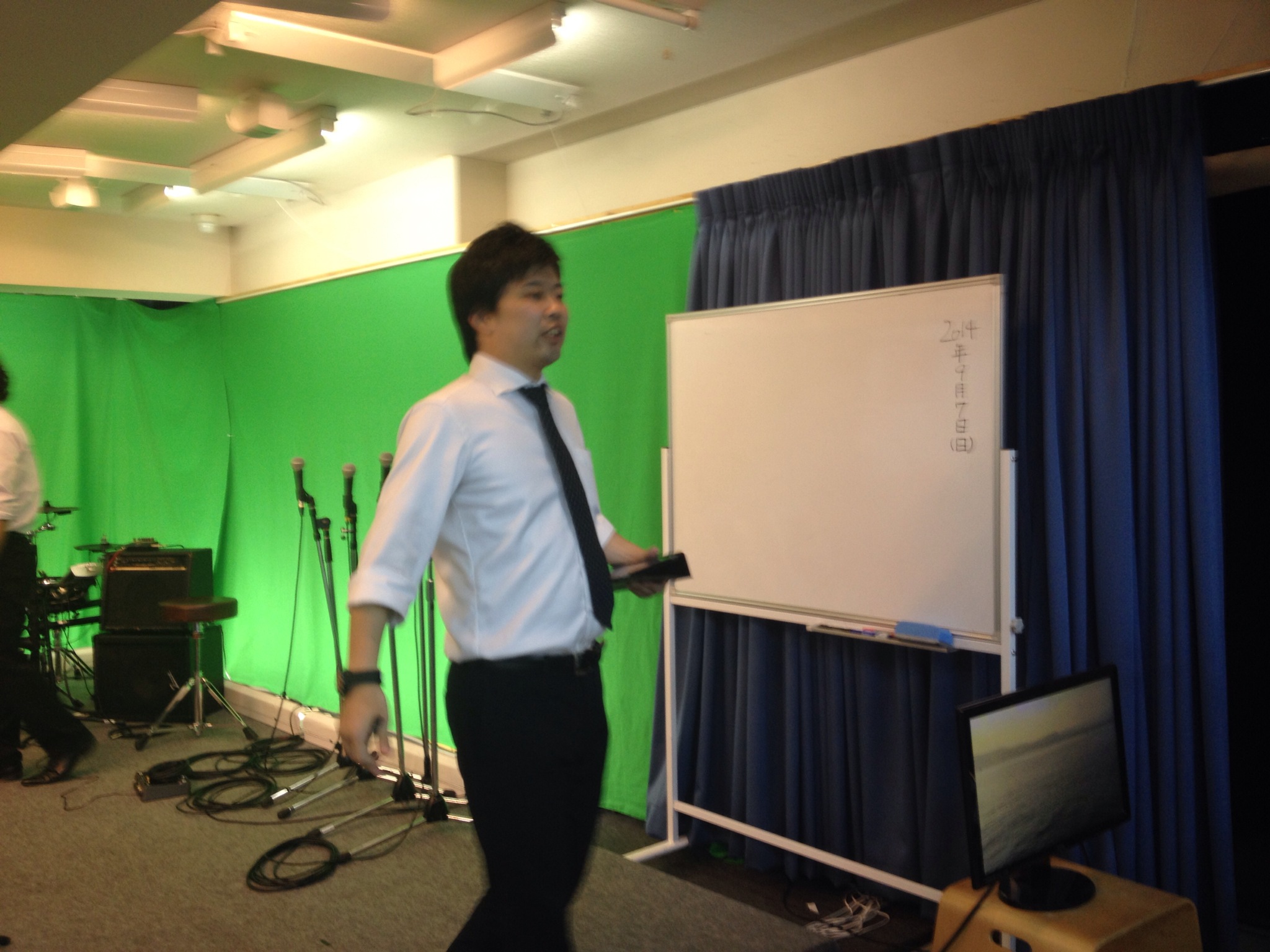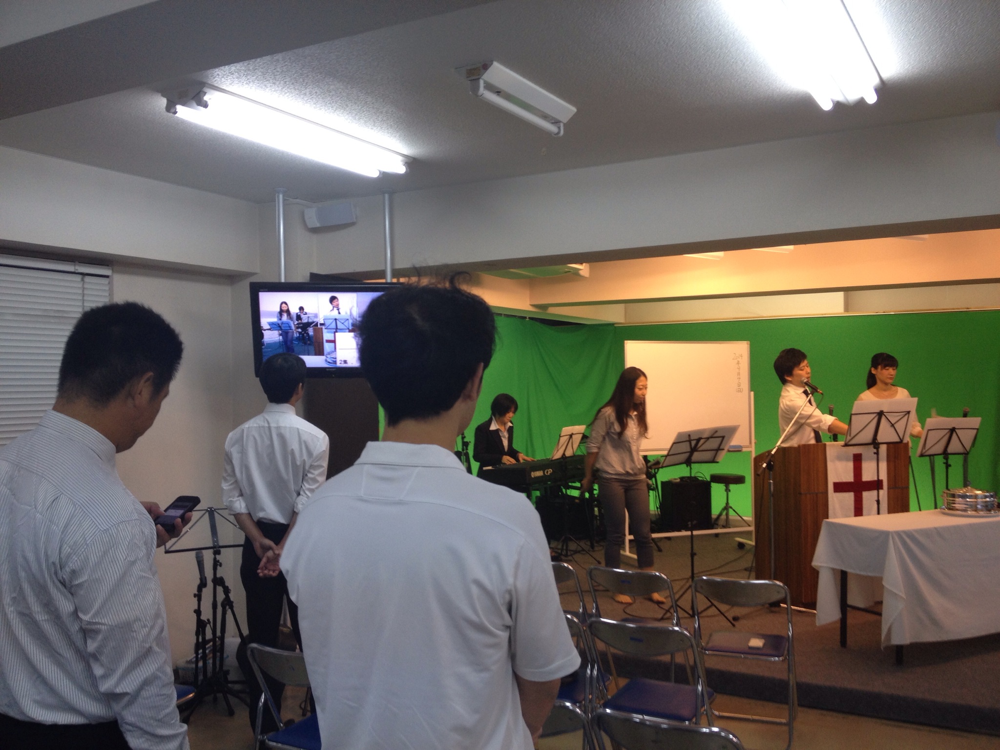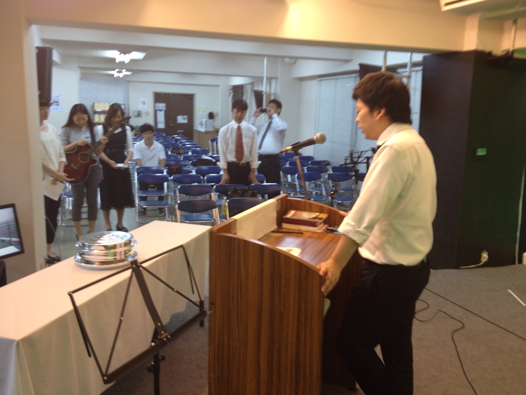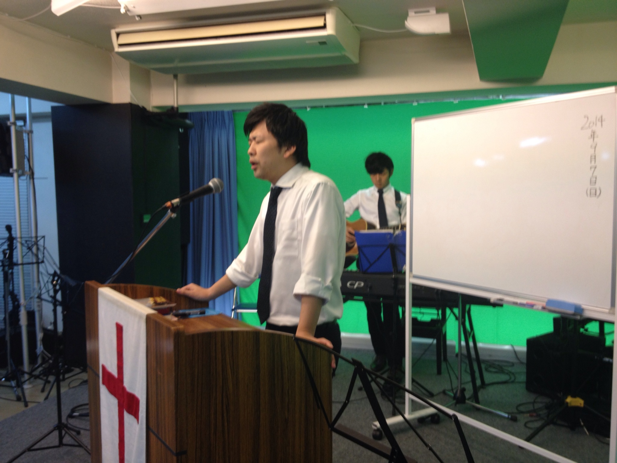 礼拝スタート! ダビデくんはギターで賛美チームに加わっていきます。