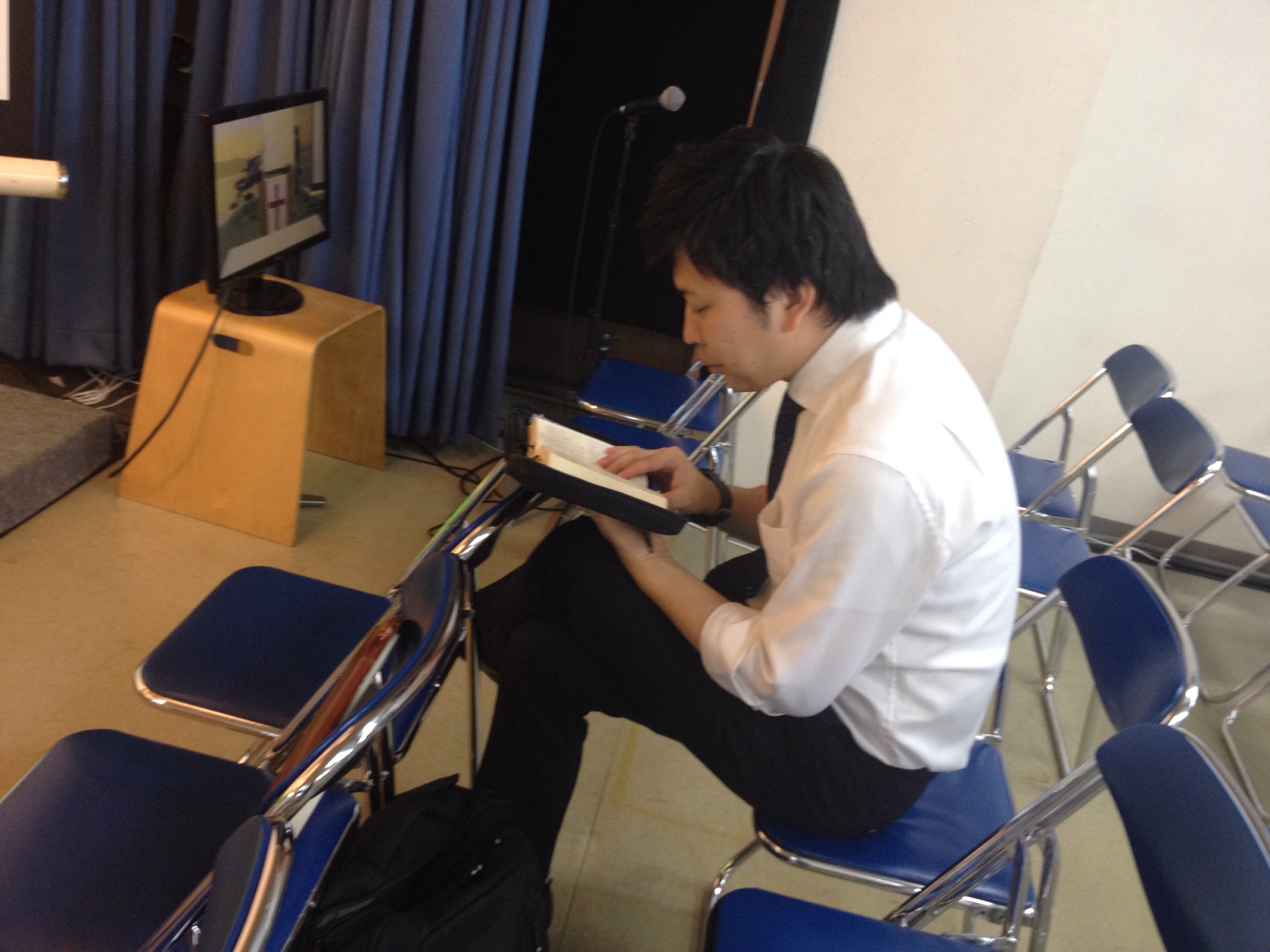 早朝礼拝でメッセージのサムエルさん、聖書を読んで備えています。