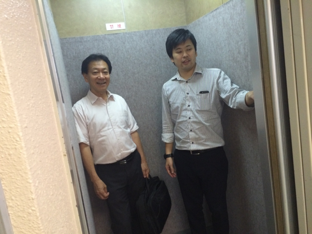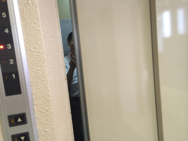 エレベーターに乗る時、ピースされる弓野さん!