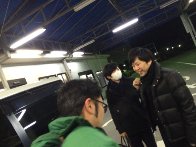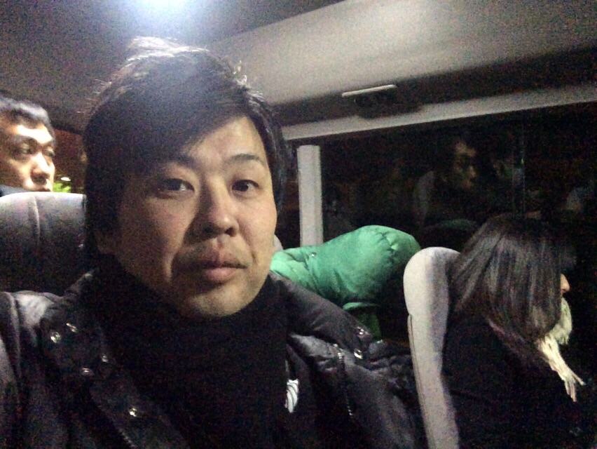 送迎バスの車内。 寒さを物語るように、ダウンに身を包むメンバー。