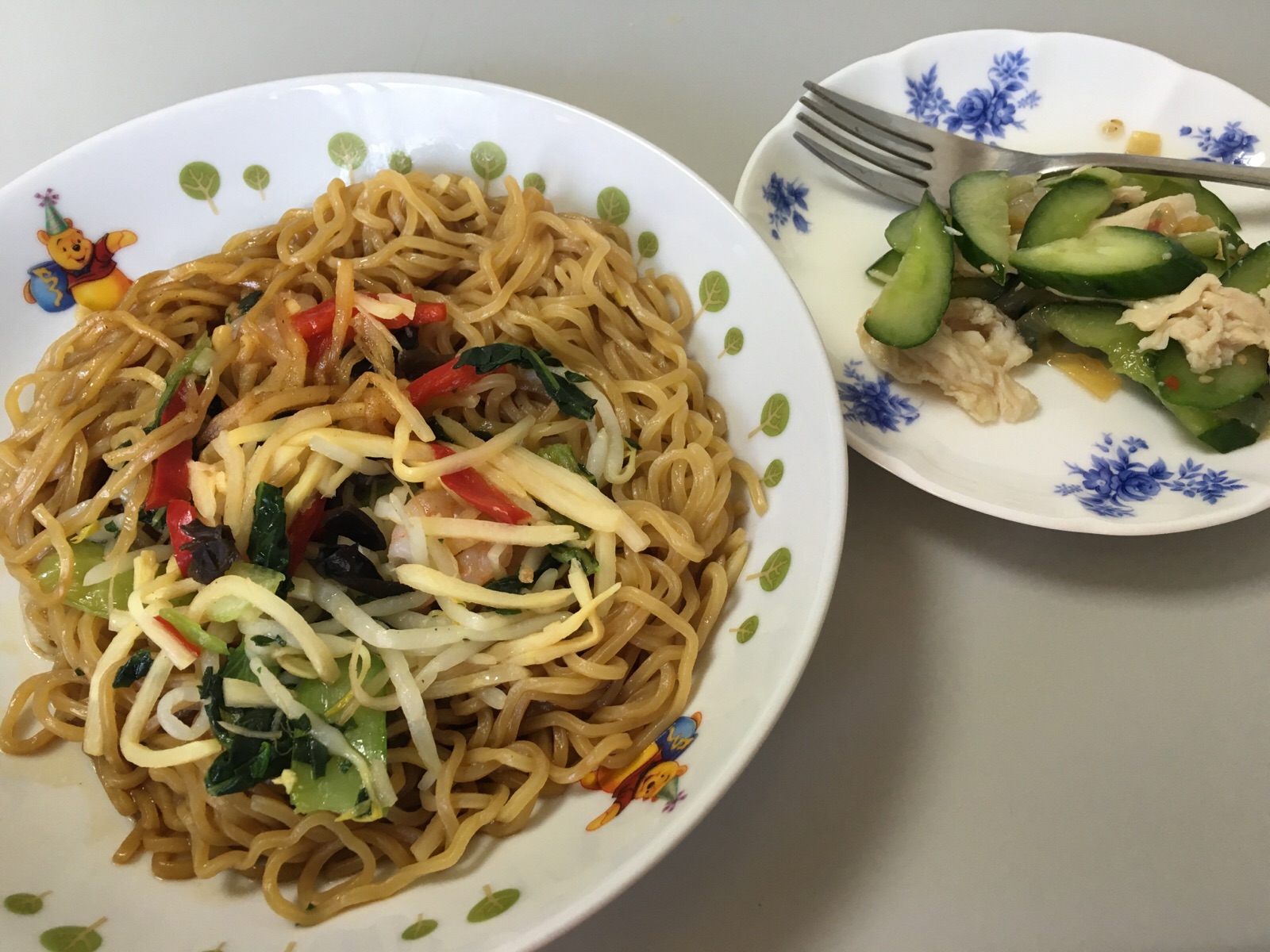 お昼食べてます。 上海風焼きそばとキューリとチキンの和え物。 Kayano
