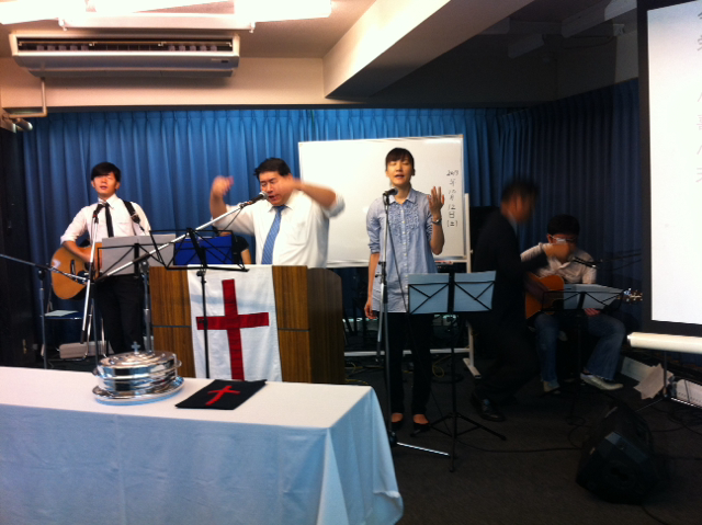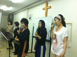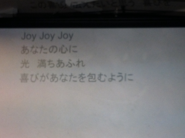 賛美ば始まってますが、ギターの伊礼さんが、ホワイトボードの後ろに隠れてました〜(笑)