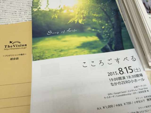 会堂の入り口、受付に置いてあるこころごすぺるのチラシ。 Gifts Kayano