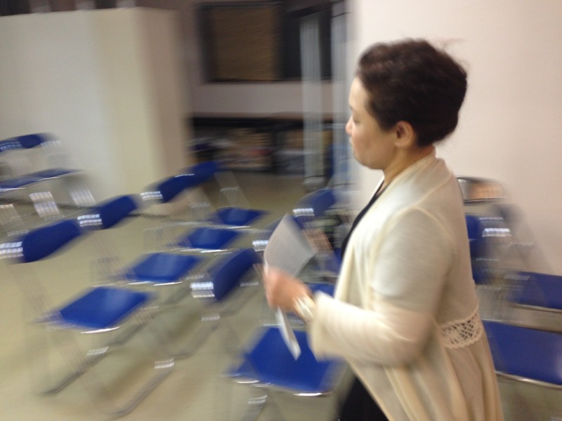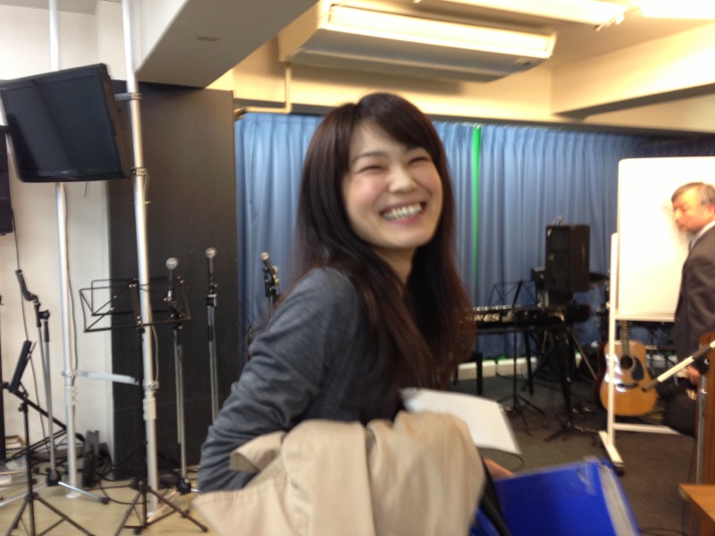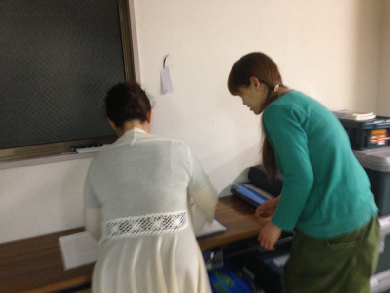 お祈り会の賛美リーダーのエルサレムの真理子さん。コーラスのゆみちゃんと楽譜を準備中の一枚。