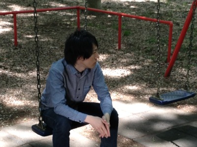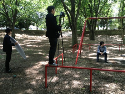 それぞれのシーン撮影に移りました。 自分の好きな場所を選びます。 拓也君はブランコを使います。 かっこいい!