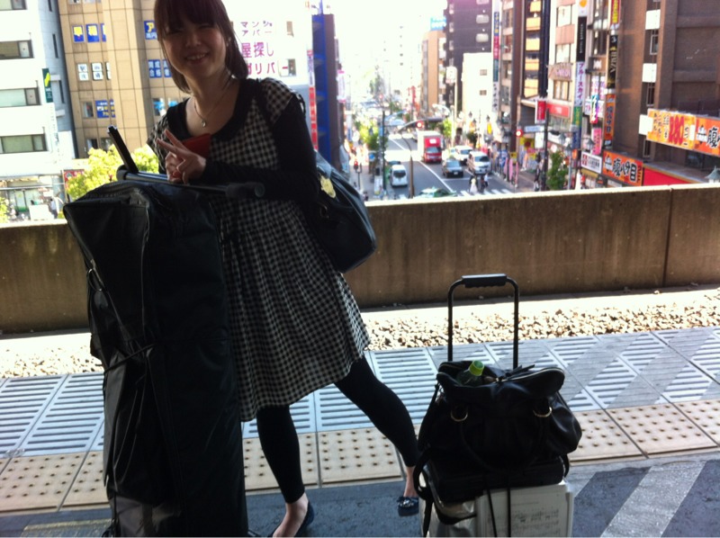 今から電車で出掛けます。 このキーボードとスピーカーを男らしく運びます!
