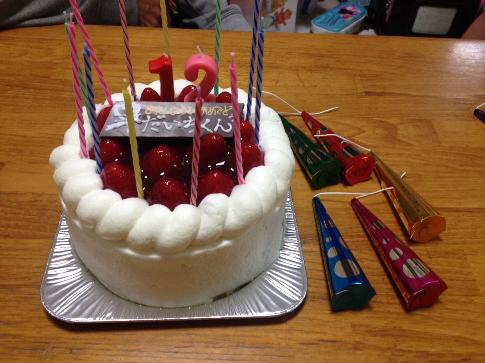 息子の誕生日、驚かそうと昨日急遽ケーキを買ってきて、ベランダに隠し息子のお風呂上がりにクラッカーをならしてハッピバースデーをしました。でも何となく気づいていたそうです。。。(笑) 仙台シオン