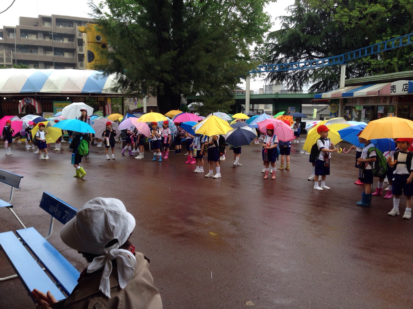 みなさん、売店や、 屋根がある所に避難しながら、 心は晴れ。 岡山 村上ょ