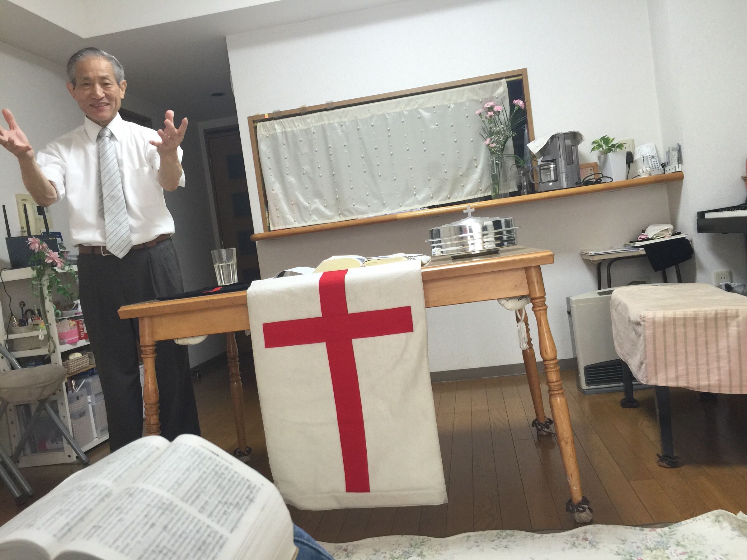 ヨシュアさん、メッセージ中☆ カウンターにはカーネーションも飾られてます♫キモチ華やか(笑 大和教会 hannah.t