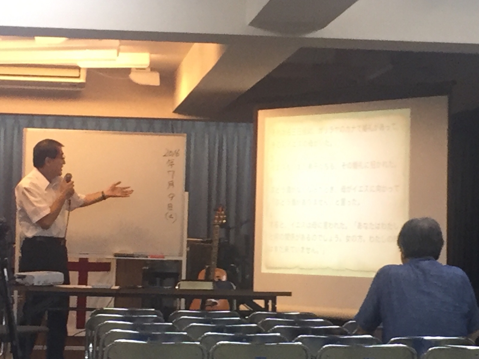 スクリーンに聖書箇所を映し出しています。