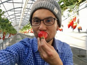 苺量チェックのため温室内を走った後はイチゴで水分補給です! オンラインせいご