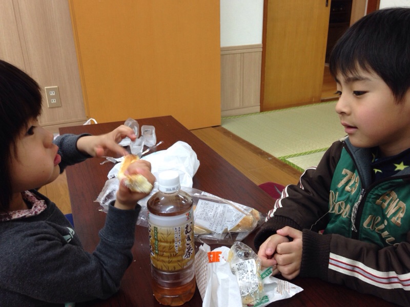 お口いっぱいにパンを入れて食べてます!(◎_◎;)パパの真似だって〜⁉︎